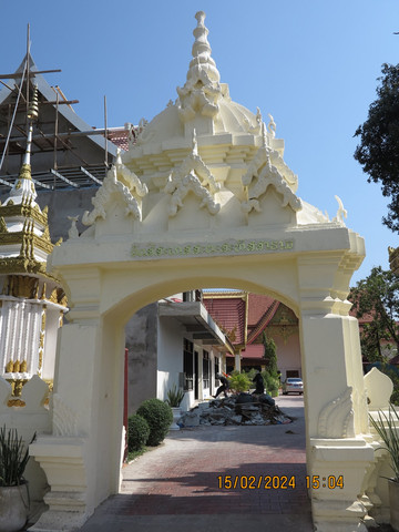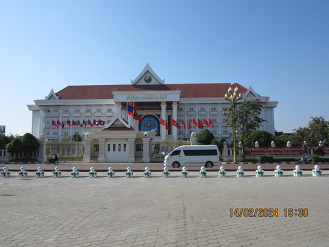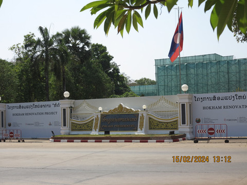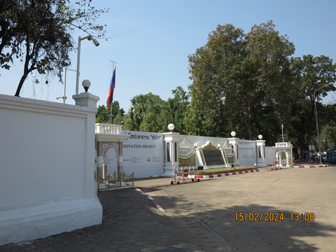 徒步到老挝国家主席府门口,内部建筑在修,围起来看不完整,门口没有警卫,随意拍照。