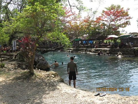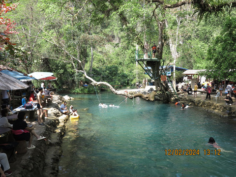 离开摩托山,去蓝洞一号,这里是个蓝色泄湖,非常漂亮,有个五米跳台可以跳水,周围滑索,天然的溶洞都可以玩。宝宝看到水很开心,陪者宝宝在蓝洞游泳,水里鱼不少,游的很开心,老婆去买了烤鸡食物,游完泳大吃一顿,非常不错。这里游客非常多,周围环境也不错,水清景美,可以好好玩。一般团队游客也就来一号蓝洞。
