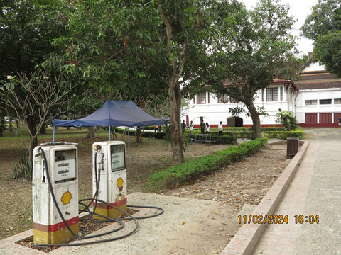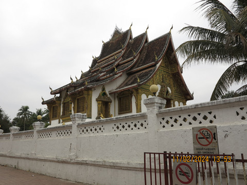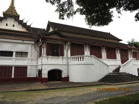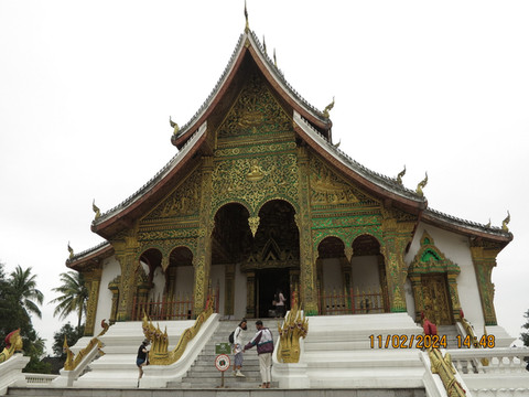 皇宫下午一点半开门,进去参观。王宫博物馆建于1904年,位于市中心,起初是西萨旺冯国王的寝宫,后一直为历代国王的寝宫,直到1975年废除君主制,将宫殿改建成了王宫博物馆。进入院子左手可以看到就是西萨旺冯国王的雕像。右面的建筑金碧辉煌,殿内供奉一座金佛,这尊金佛像是1356年高棉王国奉送给澜沧国开国国王法昂的珍贵礼物,其名为“勃拉邦”,琅勃拉邦市的名字便由此而来。游客只能在门外看,不能进入,门口工作人员说可以把钱放在盘子里,钱可以由他们带进去,好吧!随缘就放了一点功德。院子中间大建筑是博物馆,里面是国王皇后等一些物品,装饰,已经他们的卧室,整体不算太大,展品蛮精致,权当了解老挝的历史。