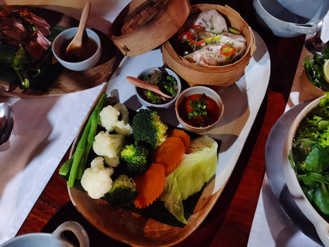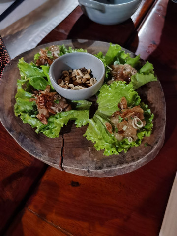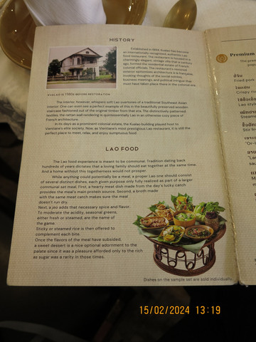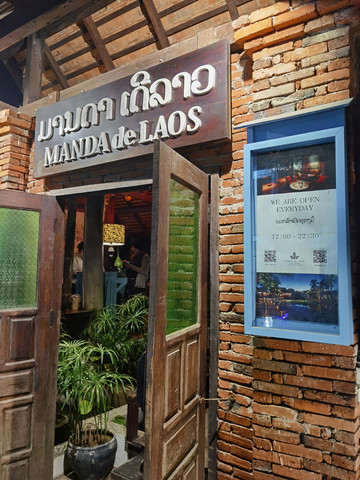 继续前行,到了老挝的Kua Lao餐厅,门口很低调,据说属于国宴餐厅,菜肴是正宗老挝菜,建筑还是有点特色的,菜肴不算太合我们的口味,价格小贵一点,最特色的老挝菜是larb,有各种larb,猪肉、牛肉、鸡肉、鱼等等。包着生菜黄瓜各种香料吃。一个小竹篓的黑糯米饭口味还行,听说晚上七点开始,会有表演,有传统打击乐演奏,也有传统舞蹈,边吃边看表演,可以感受琅勃拉邦王朝的氛围。估计价格小贵,餐厅几乎没有本地吃客,我们也算是打卡一个国宴餐厅。