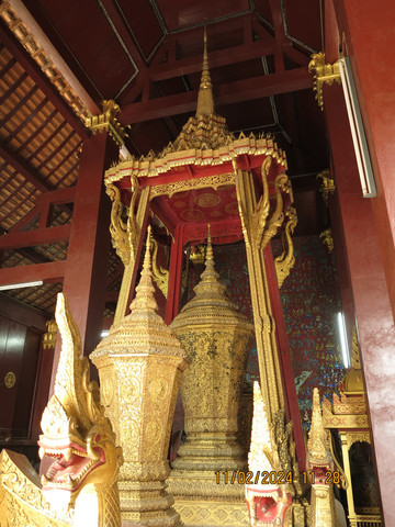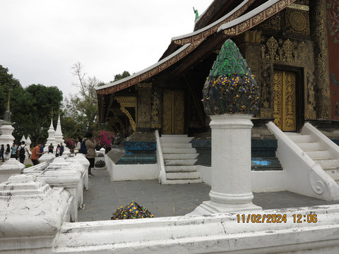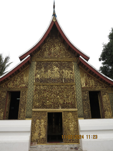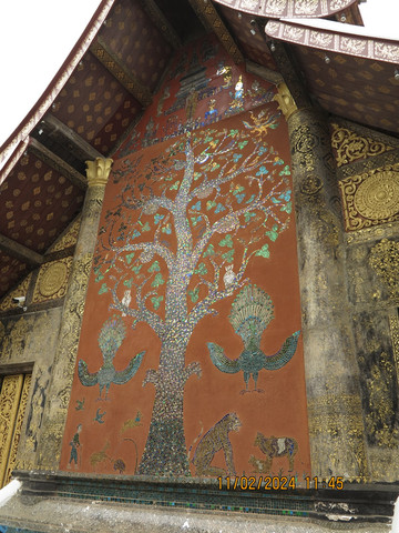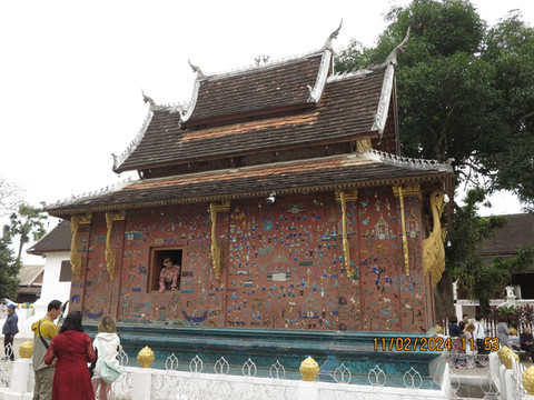 找了个中国服装店老板换了3000块的钱,这老板让我们直接微信转钱回他国内账户,不收现金,汇率不错1:3100,估计直接洗钱回国内了,生意不错。骑着摩托回酒店退房,带着宝宝老妈开启摩托自驾之旅。电瓶车确实方便,几公里外香通寺一会儿就到了。这里算是琅勃拉邦古城里最热闹,最宏伟的一座寺院,游客很多。由Setthathirat国王于1560年建造,直到1975年都是王室私有资产。香通寺选址在湄公河附近。历代国王加冕、婚礼和葬礼仪式都会在这里举行,进门第一个建筑内就是存放国王葬礼的器具,可以看到金碧辉煌的灵车。寺院面积不算大,有好几栋建筑和佛塔,大殿内部金碧辉煌,其后墙上镶嵌着壮观的生命之树图案。