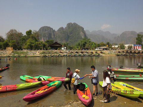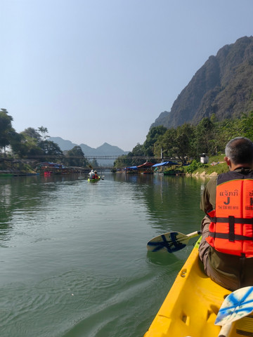 第十天:万荣的最后一天,早上整理好退房。门口等着突突车来接我们去玩皮划艇,这个是昨天旅程遗留的项目。今天没有包车,皮划艇老板安排拼车接送。一车人,大部分都是参加爬树活动。只有我们四个是皮划艇,出发点就在昨天最后探洞的那个大桥下。老板帮我们配了一个泰国小向导,老妈和宝宝一艘船,向导坐在他们船上,这样满足了老妈不想划船的梦想。