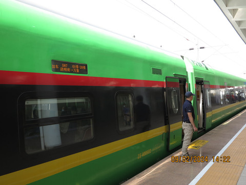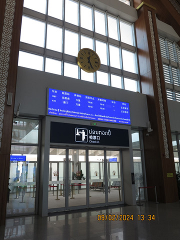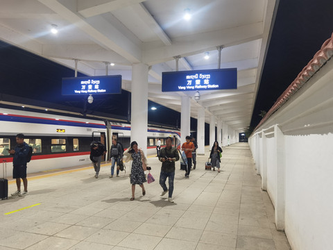 吃完走回国门,拿了行李,5万基普一个人,我们四个人正好包车去了磨丁高铁站。五公里的路程很快到了火车站,全程水泥路,肉眼可见的是火车站一过就全部是老挝土路,汽车自驾去琅勃拉邦的话4-5个小时,我们动车只要1个多小时。候车室完全中国制造,安检机,乘车流程,轨道上的货运车皮都是中国的。动车是复兴号的绿色列车,昆明到万象,一天一班。