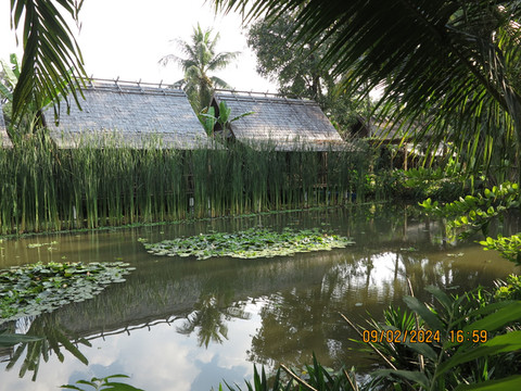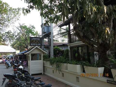顺利到达琅勃拉邦的酒店-,预定了琅勃拉邦梅森黛拉布酒店Maison Dalabua,房间定了不算很大,环境是真好,犹如热带雨林一般,酒店服务也不错,酒店餐厅居然也是联合国教科文组织有推荐,餐厅门口的荷花池非常有名,睡莲非常漂亮,预定了第二天的晚餐,主打老挝菜。稍事整理,出门走走。
