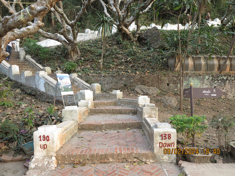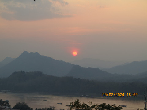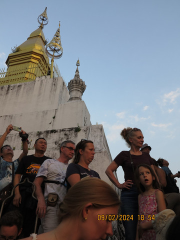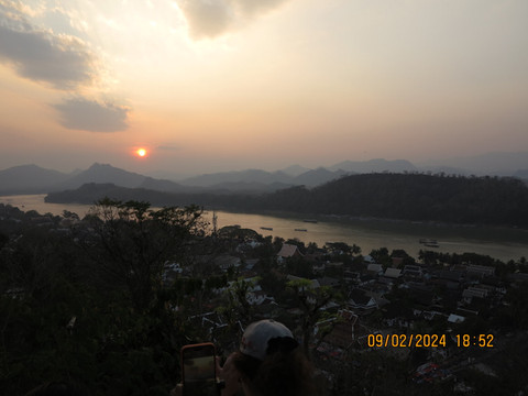 沿路走到核心街区,晚上这里是步行街和夜市,一路走走,呵呵热带饮料,问问各种旅行社,了解了这里的旅游行程,准备回酒店预定第二天的游览。一般这里旅行社的安排是来回5-6小时的行程,面包车去关西瀑布,沿路看看大象,随意游览几个地方,50美元左右,只有司机没有导游,司机不会英语。夜市边上就是浦西山,王宫博物馆的对面就可以上山,门票不贵。山不高,和我们国内名山大川不能比,这里是琅勃拉邦俯瞰全城的好地点。327级台阶到山顶,山顶有宗西塔(That Chomsi),踩着时间点上山看湄公河日落,山顶人山人海,老外也是会凑热闹,比元旦黄山日落人还多。山上蚊子不少,景色确实不错,湄公河也漂亮。