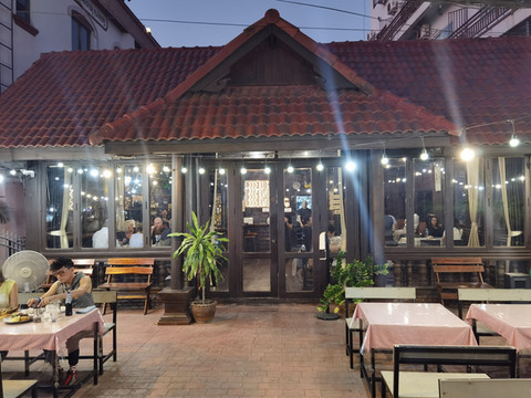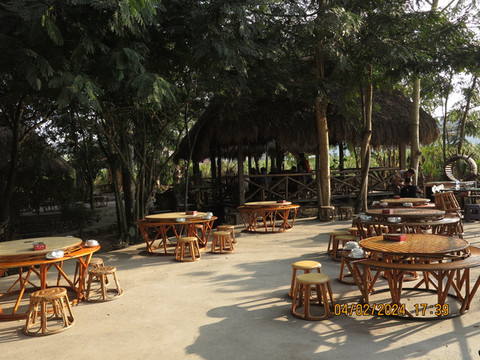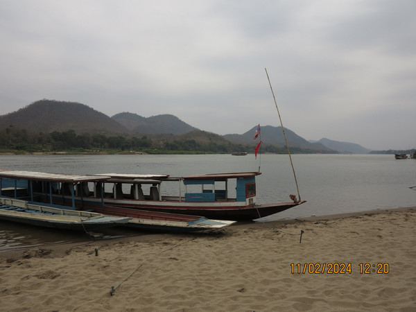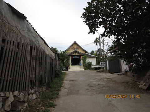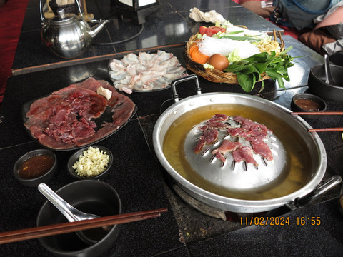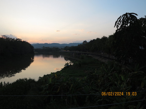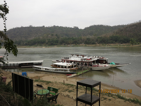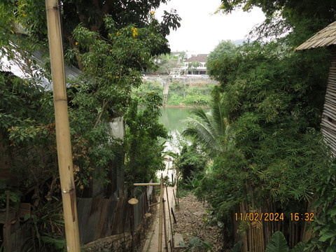 离开皇宫,时间还早,就准备在离开琅勃拉邦前去吃一次老挝火锅,找了网上介绍的老挝火锅店Restaurant Dyen Sabai。开着电瓶车,跨过南康河,找到一个土路口,火锅店就在里面,靠着南康河边,转角找个位置,看着河景吃火锅。老挝火锅就是一个锅,边上一圈可以涮肉,中间凸起的类似韩式的烧烤烤盘可以烤肉,口味还行,价格也便宜,也算体验一把。但发现中间烤盘部分焦了后没换更换烤盘,因为烤盘和涮锅是一体的。这里吃完老板会给船票,直接摆渡过南康河,对面就是拉博拉邦的核心城区了。