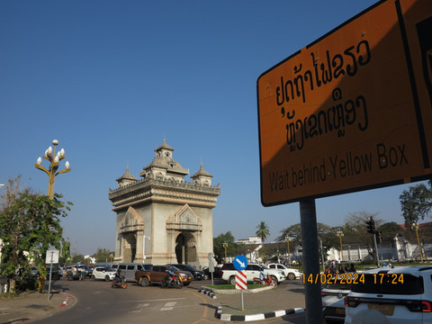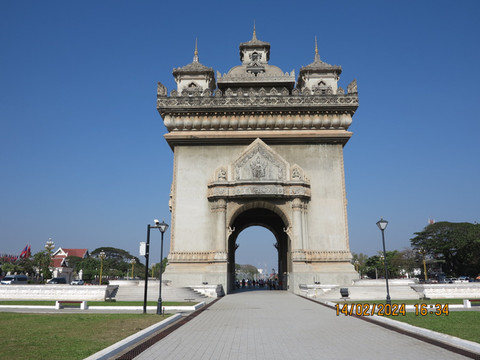 老挝凯旋门英文称:Patuxay,高45米,宽24米,位于万象市中心,沿着主路到底就是主席府。1960年开始修建,1969年基本完工,是一座大型的纪念碑。