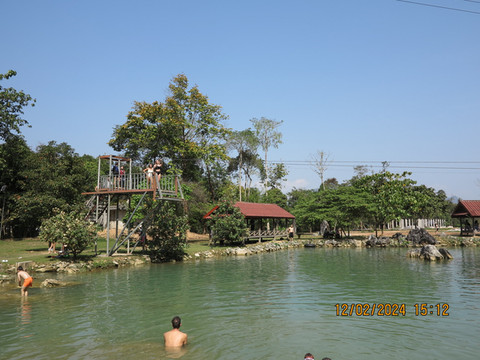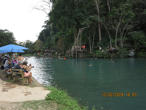 三号蓝洞稍微远一点,这里感觉更像一号蓝洞,这里也有个溶洞可以探洞。主打还是玩水,和宝宝搞个救生圈,水里休闲一把。这里周边景色不错,都是喀斯特的山头,找个水边木棚坐着休息,也可以点餐吃东西,就是老挝效率比较低,一份炒饭至少等一个小时。