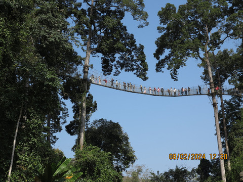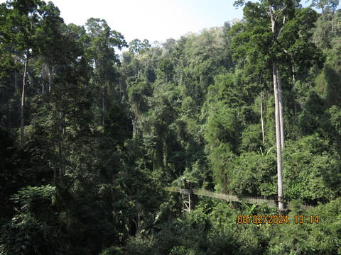 船停在了雨林码头,上岸有各种烤物可以吃,先吃饱,再游览。徒步进入景区,走走看看各种植物,吃点神秘果冰激凌,不远就是树冠行走的地方了,边上就是林奈实验室的基地。老婆客服恐高,一起上树行走。树冠走廊非常不错,茂密的原始热带雨林中,密集生存着代表东南亚热带雨林的标志性树种——望天树,在它们达七十至百米的参天巨干上,一条36米高的树冠走廊凌空蜿蜒,这条走廊原先就是科学考察使用的,走过全球无数科学家。