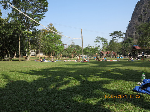 离开一号蓝洞去二号蓝洞,二号蓝洞基本没有团队游客,门口游个老挝持续旅游发展的标志牌,非常巨大。景区内草坪非常漂亮,跳水游泳滑索都非常舒服,这里欧美游客居多,草地上一躺,一玩就是一天。这里比一号蓝洞风景好,面积大,躺在草地上,随意一瞥就看到电线杆上停着巨拟叶螽斯,感叹毕竟是热带雨林,随处可见一些热带动植物。