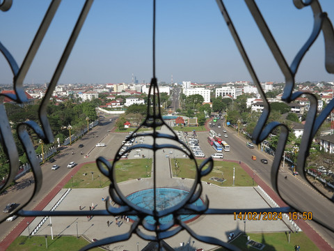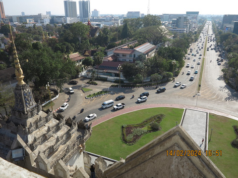 离开塔銮,老婆又软件叫了一辆嘟嘟车去万象凯旋门。这个车有点意思,类似国内的景区交通电瓶车。穿梭在马路上,可以去各个地方,我们一车四人,3公里左右的路程确认了几次,点到点一共就收5000基普,居然不是按人头收费。