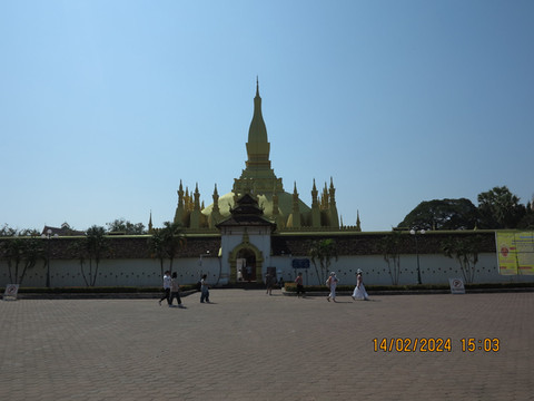 离开香昆寺,还是打车去塔銮,中午人不多,门口吃了个中国点心,口味一般般。在老挝一路吃过来,昨天晚上西餐口味很棒,但要说城市平均水平还是琅勃拉邦的各个饭店最好吃,没有发现有踩坑的地方。吃完进入开始游览,塔銮(luán)本为瓦塔銮寺的组成部分,但由于它的重要性远远超过此寺,所以人们通常只称塔銮,是老挝的佛教圣地。1566 年,澜沧国王塞塔提拉在小塔的基础上建筑大塔,并在大塔周围建造了纪念佛祖 30 种恩泽的 30 座小塔。塔建成以后,被国王命名为“帕塔舍利洛迦朱拉玛尼”,意思是佛祖骨塔,塔下埋有佛祖的舍利骨。由于这座塔是国王所建,所以老挝人习惯于称它为“塔銮”。塔銮在 18 世纪时曾多次遭到破坏,现存的塔是 1930 年按着原来样子重新修建的。每年 11月间都在此举行塔銮盛会,是民间规模最大的庙会,也是全国最隆重、最盛大的宗教节日。1957 年还在这里举行过规模盛大的 2500 年佛诞祭礼。后来曾在一年一度的塔銮盛会期间,在塔銮广场举行“塔銮国际博览会”,我国应邀参加过 7 次。