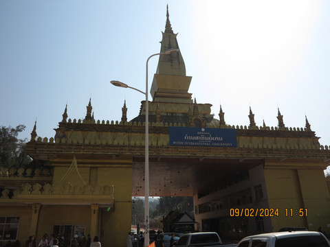 第七天:一早起床,一个人出门扫了个电瓶车,买点早餐,国门踩个点,要八点半才开关。回酒店整理完行李,吃完早餐,准备去老挝。打车不好打,老板开车送我们去了国门。门口黄牛换了2000人名币,折合620万老挝基普这里国门不大,联检大楼不大,行李过一下安检机,健康申报也不需要。过海关时盖章时,会详细询问小孩的关系和身份,并且会和小孩对话,中国海关责任心不错,出境过关还是非常顺利的。出了大楼,据说边上的免税店二楼可以免费领取香烟,但转了一圈没有看到。国门前拍照留念,徒步二百米看到了中老界碑,中老各有一块29号界碑,过了界碑就是老挝地界,有电瓶车去老挝的联检大楼,我们坐了一下,说实话只有200米的路程,一人5元没啥必要。宝宝带着植物园买的鸡蛋花头饰,开心的去老挝。