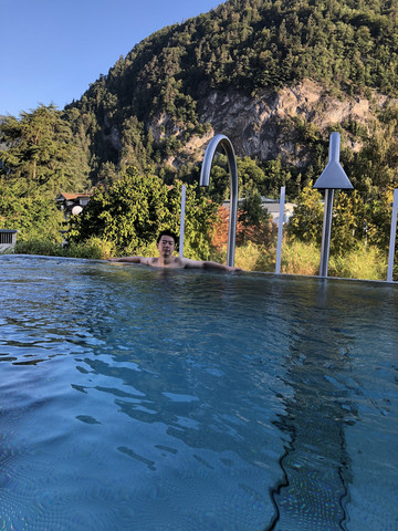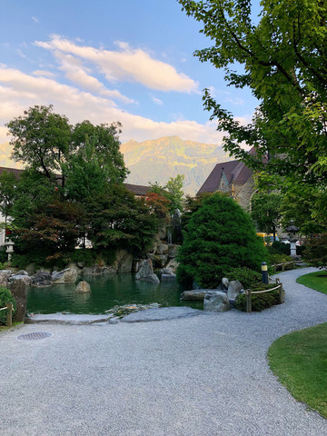 介绍一下酒店,他就位于少女峰山脚下,风景自不用说了。这里是提供高端SPA和贵妇享受奢华美容的地方,游泳池超级赞。酒店走的是宫廷古典风,公共区域是华丽丽的,但是房间就真的很一般,也不大,关键是夏天没有空调,只有电风扇很闷热