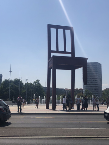 万国宫前的广场上,是日内瓦艺术家丹尼尔·伯塞特的雕塑作品-断腿木椅,为1997年国际残联呼吁人们关注战争中地雷对平民造成的伤害而建立,给人们留下了关于战争与和平的思索。
