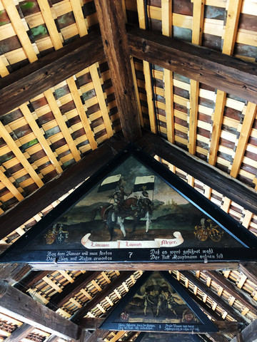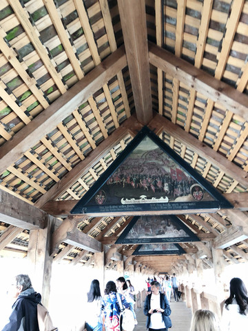 如果你喜欢宗教和历史,廊桥里面廊檐下的梁上有上百幅宗教历史彩绘,描述了守护琉森的圣人和古城发展史。廊桥连接着琉森两岸,老城区古老淳朴,地方也不大。欧洲这样的城市真的很多,布拉格、布达佩斯、维也纳都是可以步行去穿越欣赏的。