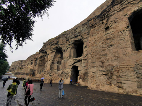 云岗石窟的雕像群虽依山壁而雕凿,但多先掏洞,为增加作业面,很多洞窟都有上下两个开口,就是上下两个作业面。洞开凿完毕后,再进洞雕像。早期的洞窟,一个洞窟即是一座寺庙,有住持。洞窟开凿好后,前面再加木楼殿堂,使洞窟增加了深度,和空间。如今这些前木制殿堂大多损毁,有后来仿建的,但似乎已丧失了与洞窟的和谐关系。