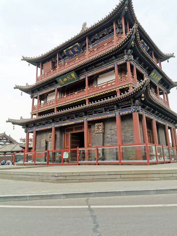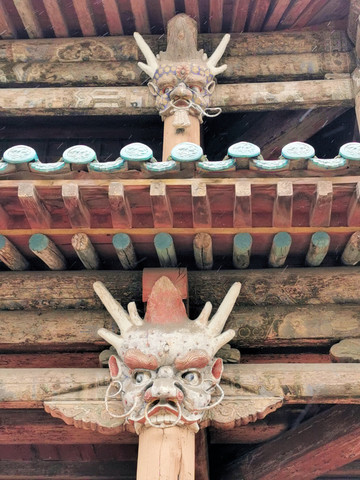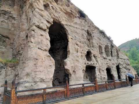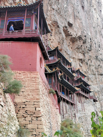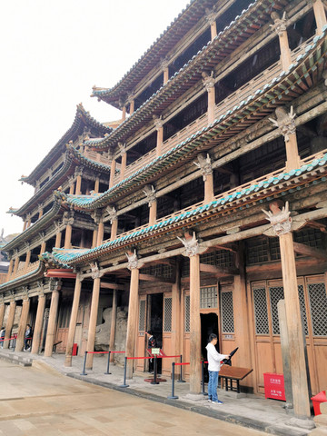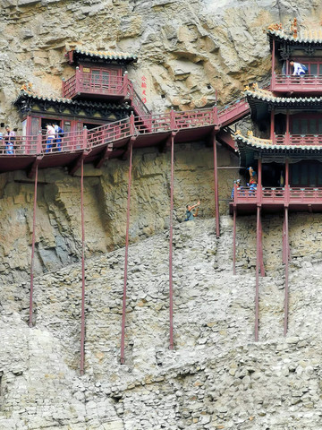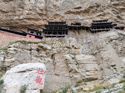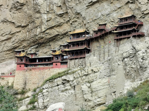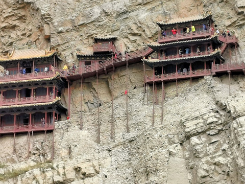 晋北还有一处天下闻名的古迹,那就是悬空寺。悬空寺位于大同市浑源县。始建于北魏年间,现在的建筑则为明清时重建的。整座寺庙靠镶进崖壁的27根直径50公分的横梁承担,远看如同悬在翠峰山半空,故名悬空寺。该些横梁均用桐油浸泡过,一端以卯榫结构固定在山体,突出部分承担上面的寺庙。另外寺庙下面还有十几根直立的木柱,木柱也就二、三十公分直径,有些甚至会随风摆动,它们并非主要承重结构。寺最高点距谷底有90多米。有意思的是,这是座佛、道、儒三教同一屋檐下的庙宇,在其三教殿内同时供奉释迦摩尼、老子和孔子,完美体现了同一蓝天下,和谐共存的神州梦。由于其结构特点,所以特别规定,每次入内的游客不得超过80人,所以在旅游旺季,山下排队之人有数百之多,经常等两、三个小时才能“悬空”一下。寺庙下方岩壁上的“壮观”二字据说是李白手迹,原存于华严寺,后勒石于此,也是绝配。(据说2013年,曾发现有人在距离悬空寺不到一公里的地方私自开挖煤矿,后被取缔。)