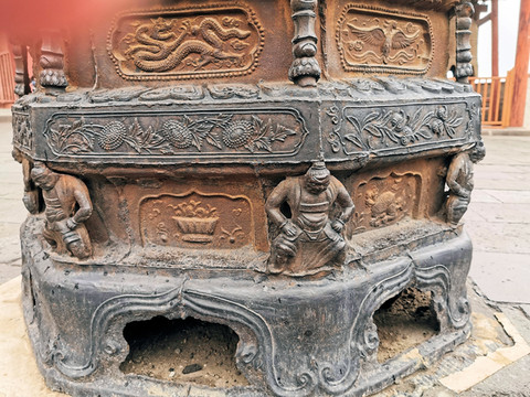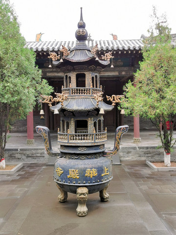 后世有“太武灭佛,文成复法”之说。佛道两家也明争暗斗,乐此不疲,两边都知道巴结皇帝,求得龙颜一悦,即可藐视其它。后来,在华严寺看到大雄宝殿前的香炉最底下几个跪姿顶炉的铁人像,竟然头挽髻,着道袍,口诵阿弥陀佛的和尚们如此行事,其实一点儿也不慈悲,挺小心眼儿,哈哈哈哈!