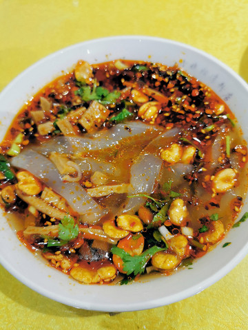 在浑源县城还品尝了“小媳妇凉粉”。据说有个故事,一位北京汉子到大同浑源,在一家小店要了碗凉粉,惊艳于凉粉妹的姣好容貌,回京后仍念念不忘。一年后,再到浑源欲向凉粉妹表达爱意,未想,凉粉妹已然人妻,痛悔不已。这故事编的有点儿磨叽,北京爷们儿不应当如此娘泡,吃凉粉的时候就直接递话:“妹子,给我当媳妇吧!”心酸姻缘一段,凉粉则是酸辣有味儿,滑嫩不散,清凉爽顺,好!又来了!