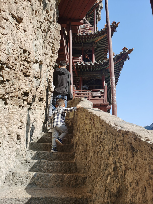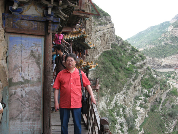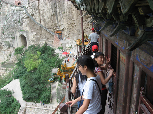 这次我虽然没有上去,前次上去的感受依然记忆犹新:每上一个台阶就感到险峻增加了一分,高空晕眩的感觉越来越强烈,走在栈道上真是如临深渊总有掉下去的担心,走在木板上滋滋的响总害怕出现闪失,看见有人摇晃似乎是支撑挑梁的木柱,总有时刻要轰然塌下的感觉。总之,是“不踏实”的感觉。