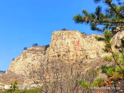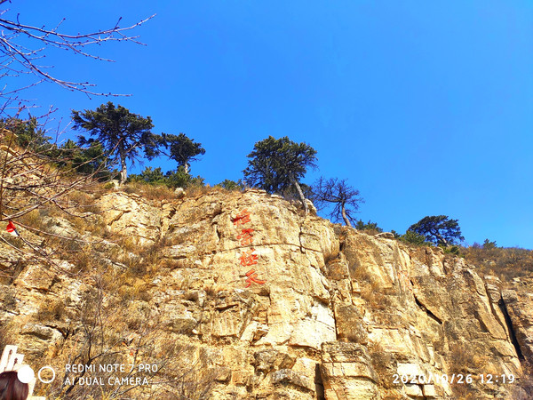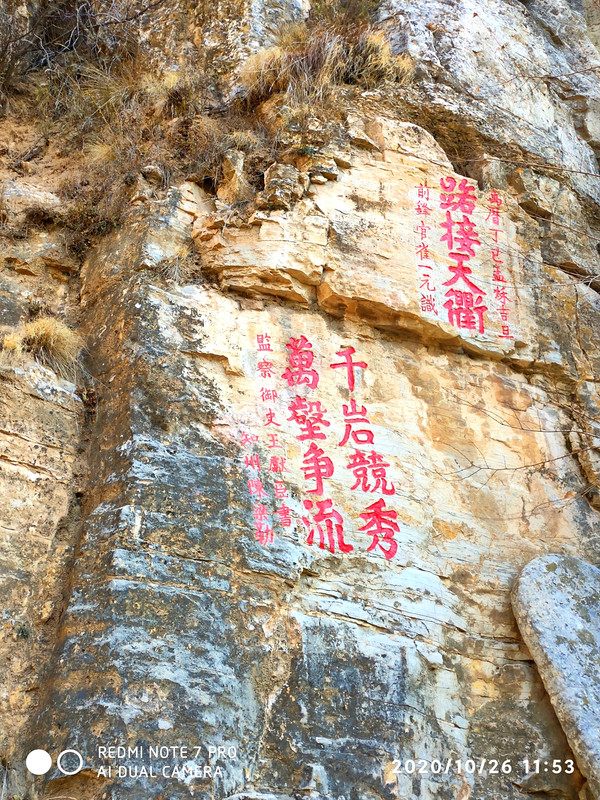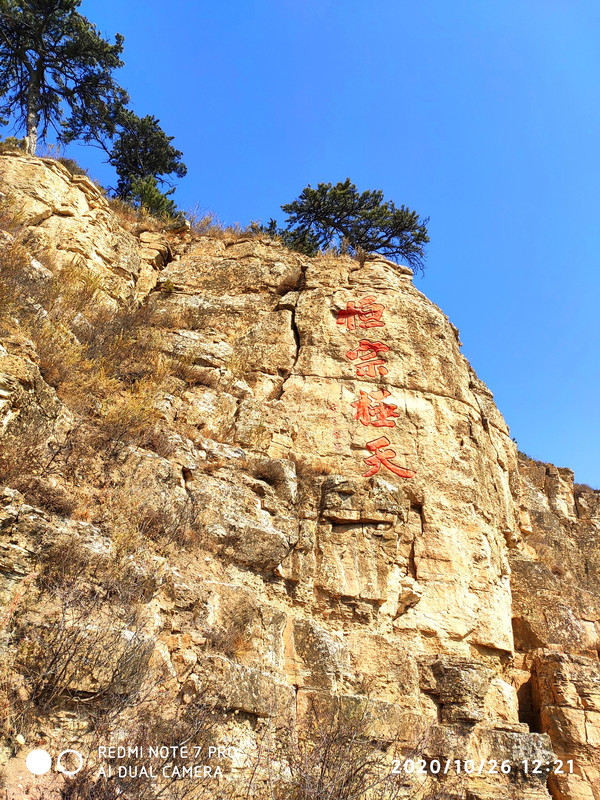 山体上有“恒宗”两个大字,这个是明成化三十年大同知府张升手笔,每个字高13米,宽6米,面积达30平方米。大“恒宗”左侧还有题缩小的“恒宗”二字,看不清落款。上方还有小篆“大明”二字,恒山的摩崖石刻,字周围经常要写一些小字的内容,也算是个特色。