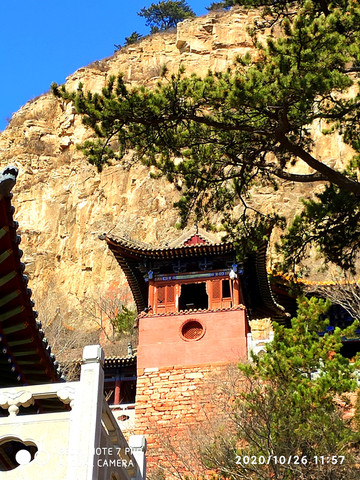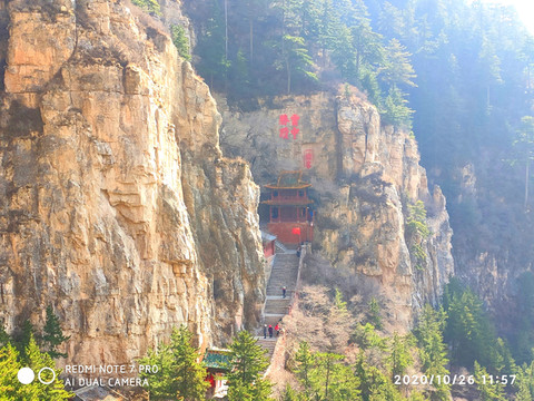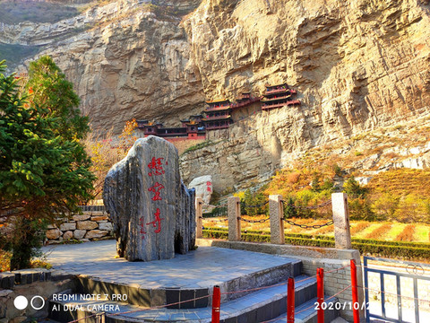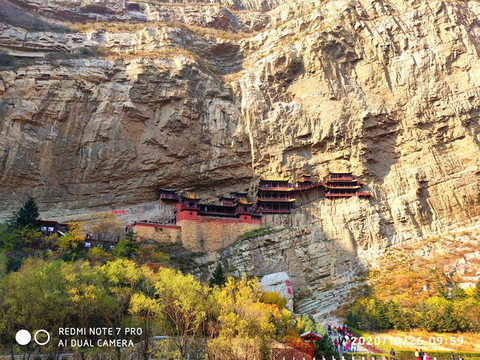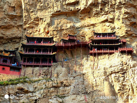 悬空寺位于恒山金龙峡西侧翠屏峰的峭壁间,素有“悬空寺,半天高,三根马尾空中吊”的俚语,以如临深渊的险峻而著称。该寺建成于1400年左右前北魏后期,是中国仅存的佛、道、儒三教合一的独特寺庙。李白的《夜宿山寺》:危楼高百尺,手可摘星辰。不敢高声语,恐惊天上人。就是对悬空寺的险峻危境的描写。