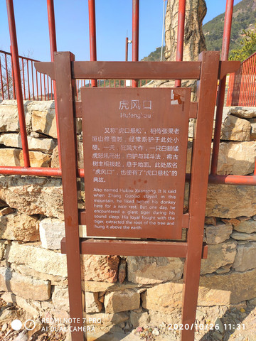 虎口悬松:即虎风口与悬根松,在步云路的石阶风口上,人到此处,清风飕飕,松涛阵阵,犹如虎啸龙吟,临风屹立着一株参天古松即悬根松,根茎盘露,紧抱岩石,遮日留阴。相传松根外悬是张果老拴在树上的神驴受惊而拔起的。
