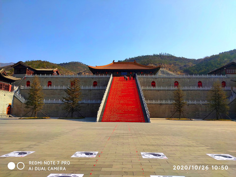 北岳庙是山上最宏伟的一座庙观,它建于明代,背倚恒山主峰天峰岭。庙宇进深五间,廊前是一座恒山真迹图,上刻恒山全景,是一座颇具价值的文物。