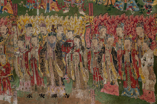 后壁绘十大明王,体量高大,造型奇诡,线条刚劲流畅。据说,明王为使世人醒悟痴迷,常以狰狞面目出现,如同棒喝,使人迷途知返。但传法正宗殿内的不动尊明王艺术形象却和前述不同,是永安寺壁画中的精品。