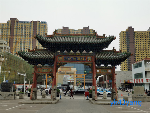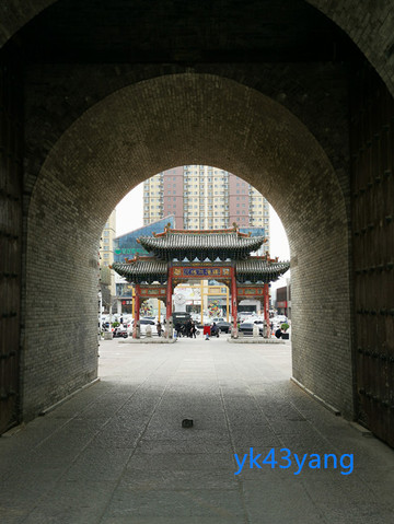 由谯楼门洞南望,可以看到木牌坊的背面额题为“保障三城”。