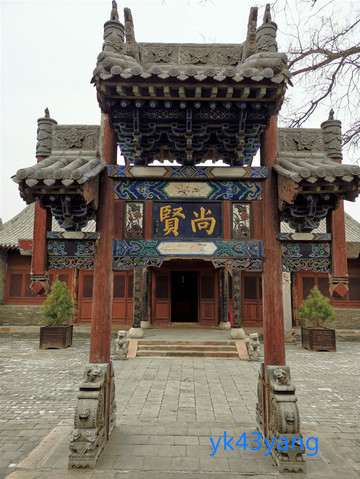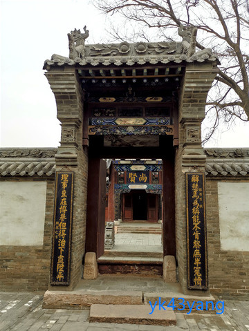 穿过墙门,进入二堂庭院。庭院中立有一座单门木牌坊,其结构很是特殊。正面的额题为“尚贤”两字。背面的额题为“睦里”两字。