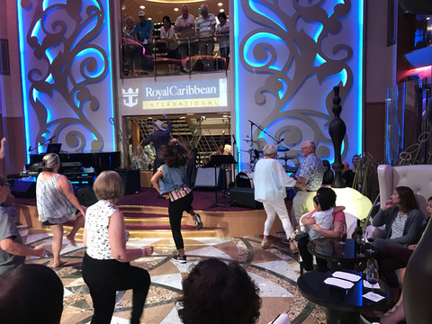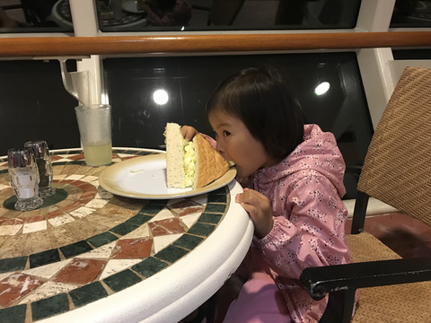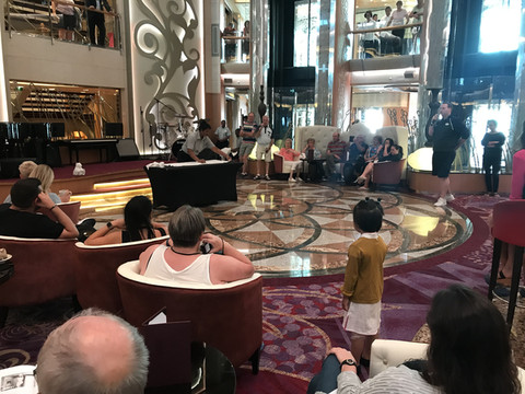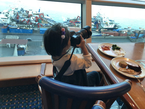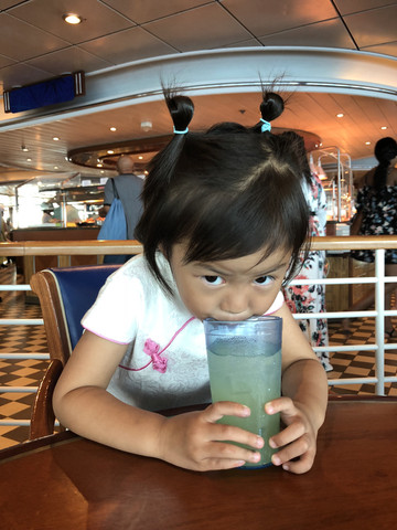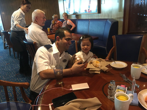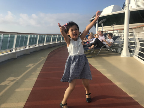 邮轮还专门为小朋友开了托儿班,期间,大人们可以在船上做自己的事或休息,我们家孩子上下午分别参加了二个多小时的托儿班,在邮轮幼儿辅导员的带领下,与十几个各国小朋友(就我们一个中国孩子)一起做游戏,孩子玩的非常的开心,大人们也舒心。