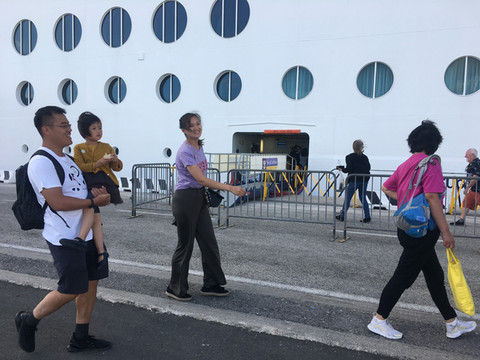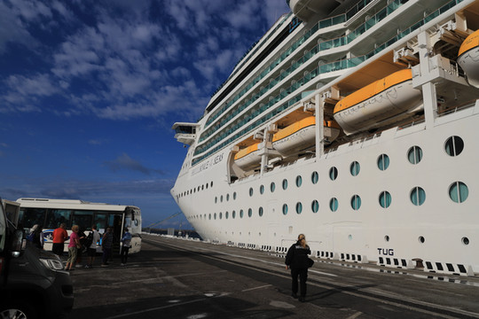 乘10分钟邮轮摆渡车出了邮轮港口,看到有很多旅游公司在招揽顾客,港口对各个旅行社管理的很严格,我们从港口的车子下来,并没有旅行社的人一拥而上的混乱局面,他们都规规矩矩地在原地等我们过去,他们只是老远与你打招呼,我们一点也听不懂,能感觉的出他们是在叫你过去。