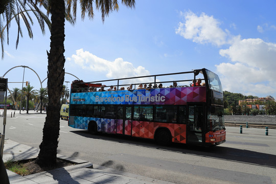 酒店门前巴塞罗那市区景观车,景观车用红黄蓝绿等颜色分不同线路。这次我们来巴塞罗那旅主要是雇车,所以没有乘坐这款景观车。