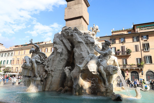 四河喷泉中的雕塑分别象征着四条天堂河流(多瑙河、尼罗河、普拉特河与恒河)以及已知世界的四个角落(亚洲、非洲、欧洲和美洲)。