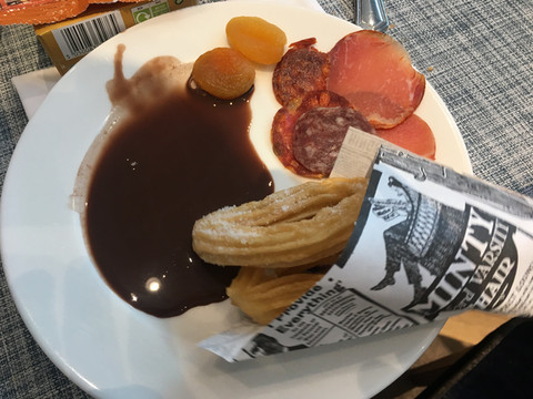 酒店提供的早餐,西班牙油条沾巧克力,西班牙香肠和杏干儿,这可是来西班牙必吃的当地小吃。