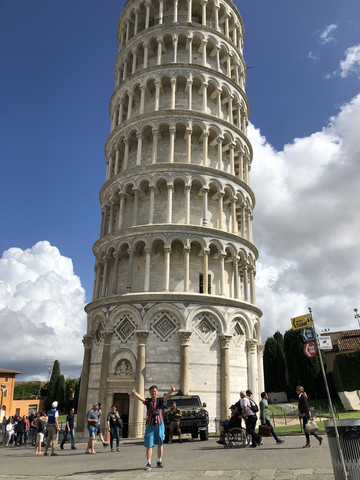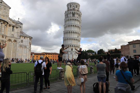 比萨,里窝那距比萨斜塔23公里,乘车半小时,比萨的名气,很大程度上是受惠于比萨斜塔。该塔竣工于1350年,但是工程早于1174年就开始了。当年,工程进行到第三层时,人们就发现,由于地基、建筑结构等原因,塔身出现了倾斜。于是工程中断了。后来当政者变了,又延请了新建筑师继续了此工程。随着时间的推移,比萨塔的倾斜程度不断增大,目前已达到4.5米,而且倾斜度还以每年1毫米的速度继续增加。可能正是由于它的斜,和别人不一样,名气应了“歪打正着”,变得越来越大,参观者络绎不绝。