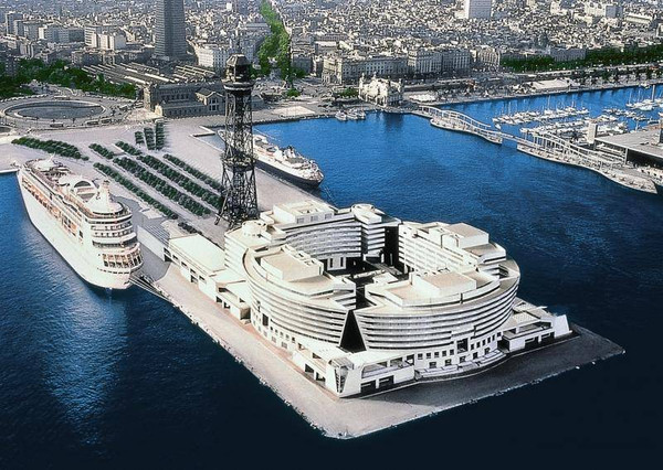 欧洲之星玛莲娜酒店,酒店位置非常好,在一个人工栈桥上,三面环海,正面对着哥伦布广场和兰布拉大道;照片右面是邮轮码头,码头停靠着很多邮轮;照片左面是海滩、商场和吃饭的地方