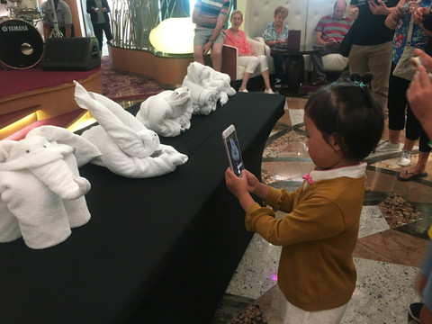 邮轮房间服务员为旅客表演叠毛巾的手艺。