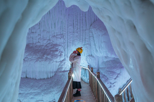 各种形态的冰雪布满洞中,冰瀑、冰柱、冰笋、冰钟乳、冰石花……他们已经存在了几百万年,仿佛将永远不会融化,奇特壮观。