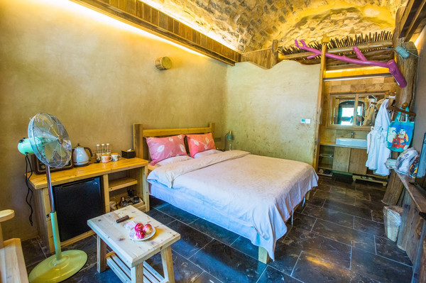 走入房间内,俨然就是地道的窑洞房,却又无需担心房间的舒适度和配置。泛黄的石墙、木质的家具营造出怀旧氛围。整洁的床品、现代化生活用品打造出家的温暖和舒适。