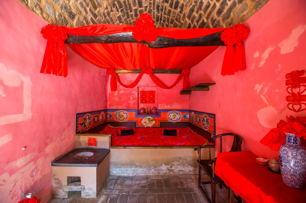 走入窑洞,一望便知这里是一对新人的婚房,房内装饰以大红色,红得喜庆而耀眼。