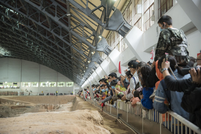 1号坑是最壮观的一个车马坑,后面还有未完成修复的场景,但十一工作人员也放假,所以看不到考古工作者在修复。
