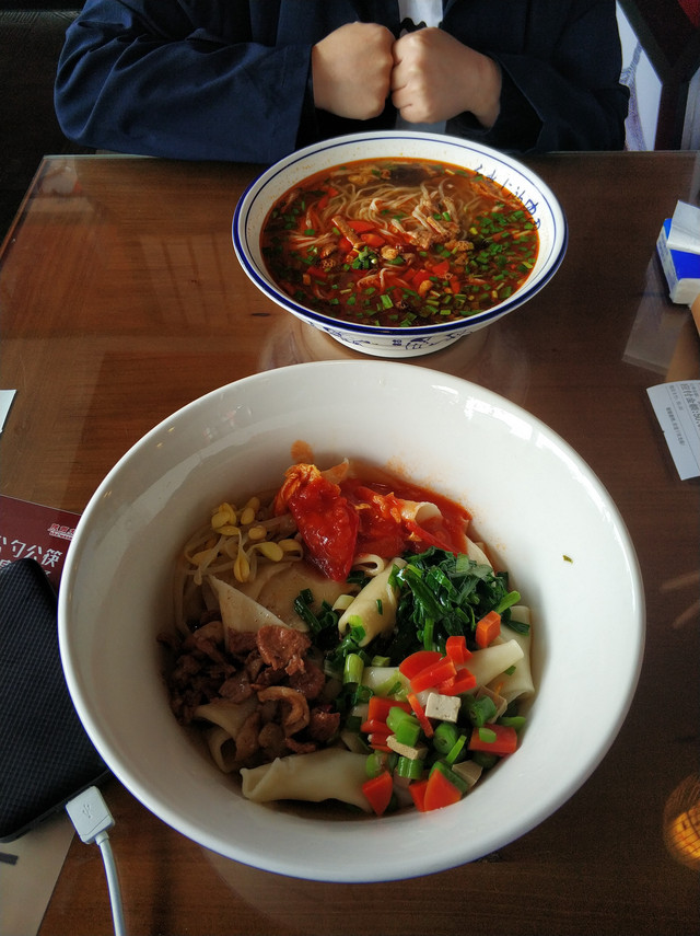 中午吃了一晚当地特色的biangbiang面,有点类似手擀面,很劲道,非常好吃。朋友叫了一晚臊子面,醋味有点重,不过也很好吃。