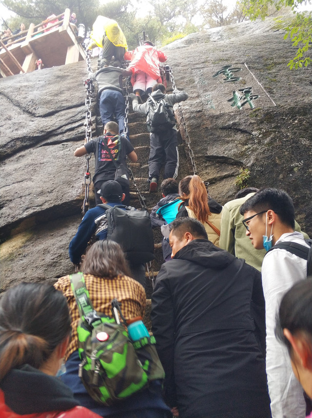 整个东峰都笼罩在云里,鹞子翻身的终点下棋亭都若隐若现,不多停留,我们直奔南峰的长空栈道,结果还是慢了一步。就在我们前面20个人的位置停止检票,听说前面排队已经排到了1个半小时开外,流量已满,不放人了,分外遗憾。不过算算时间,如果在这里再等上一两个小时,我们很可能来不及赶上下山的索道,也只能放弃了。