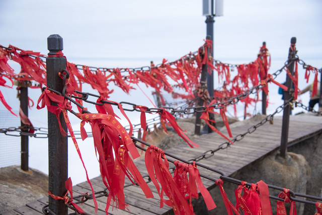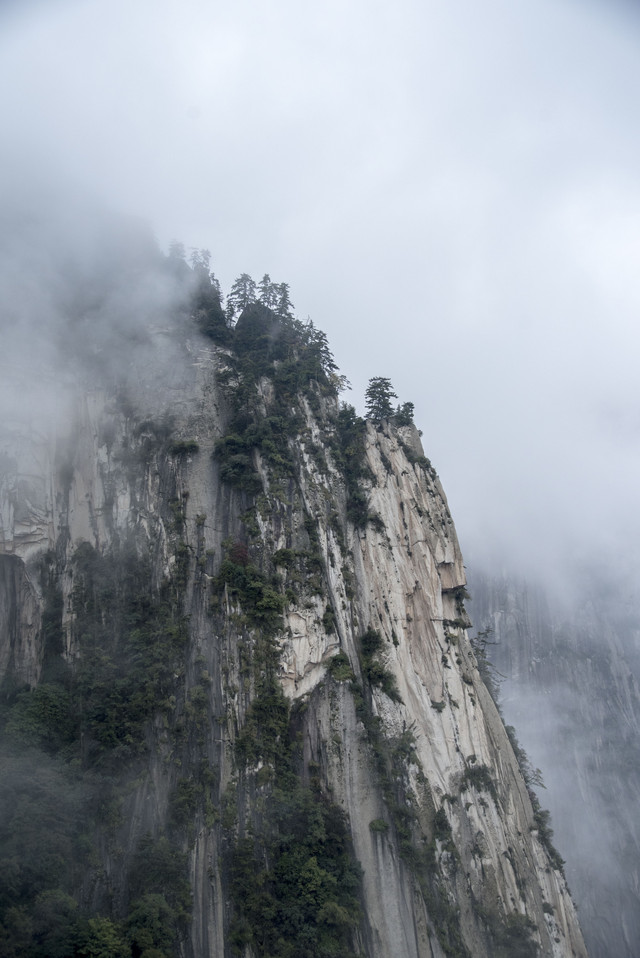 从西安去华山很方便,有高铁半小时就到,下车后坐1路公交,一车人全是去华山的,司机问清楚没有要中途下车的人,干脆就一路不停车,直接拉去华山门口。我们以为自己到的已经够早了,结果景区门口队排得老长……天上在淅沥沥的下着小雨,我俩很担心一直下雨没法好好玩儿,但也只能耐着性子排队。缆车的队比门口的更长,等了一个多小时,加上景区里坐小巴车到缆车下的时间,上到北峰上已经快中午了。但令人欣喜的是,雨停了。