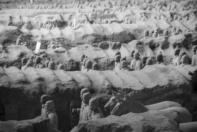 兵马俑博物馆有3个馆,也就是3个开掘的兵马俑坑。下面的士兵气宇轩昂的齐刷刷列队,上面的游客乌泱泱围观,大眼瞪小眼一番,撤吧~