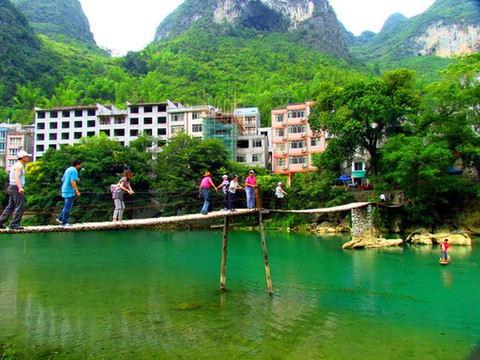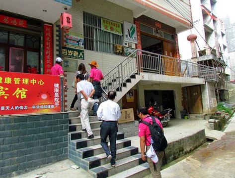 盘阳河是巴马的母亲河,长寿河,两岸奇峰峻峦,村屯错落。车友们来到河畔上的一座吊桥前,从这里过桥来到巴马的一个长寿村,探望这里的老人。只见村中街道两旁的小楼前,时而能见到该座楼主主人图文并茂的介绍,多为百岁老人的简历。