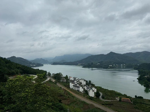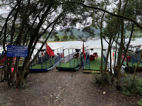 说回渠洋湖的景色,个人认为,当天气晴朗的时候,这一波绿水在一座座青山的环绕下,应该令人着迷。但问题是,我们来的时候天气不好,阴暗的天空中时不时飘下来几滴小雨。幸好渠洋湖的湖水没有受到暴雨的影响而像鹅泉一样浑浊,我们在船上近距离感受青山绿水,还是比较舒服的,只不过距离网上看到的“卖家秀”还是有些差距的。